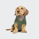 Ein Wintermantel speziell für Dackel mit bequemer Passform, warm mit Fleece gefüttert und vollendet mit einem stark wasserabweisenden, eleganten Wollmix in Dunkelgrün.