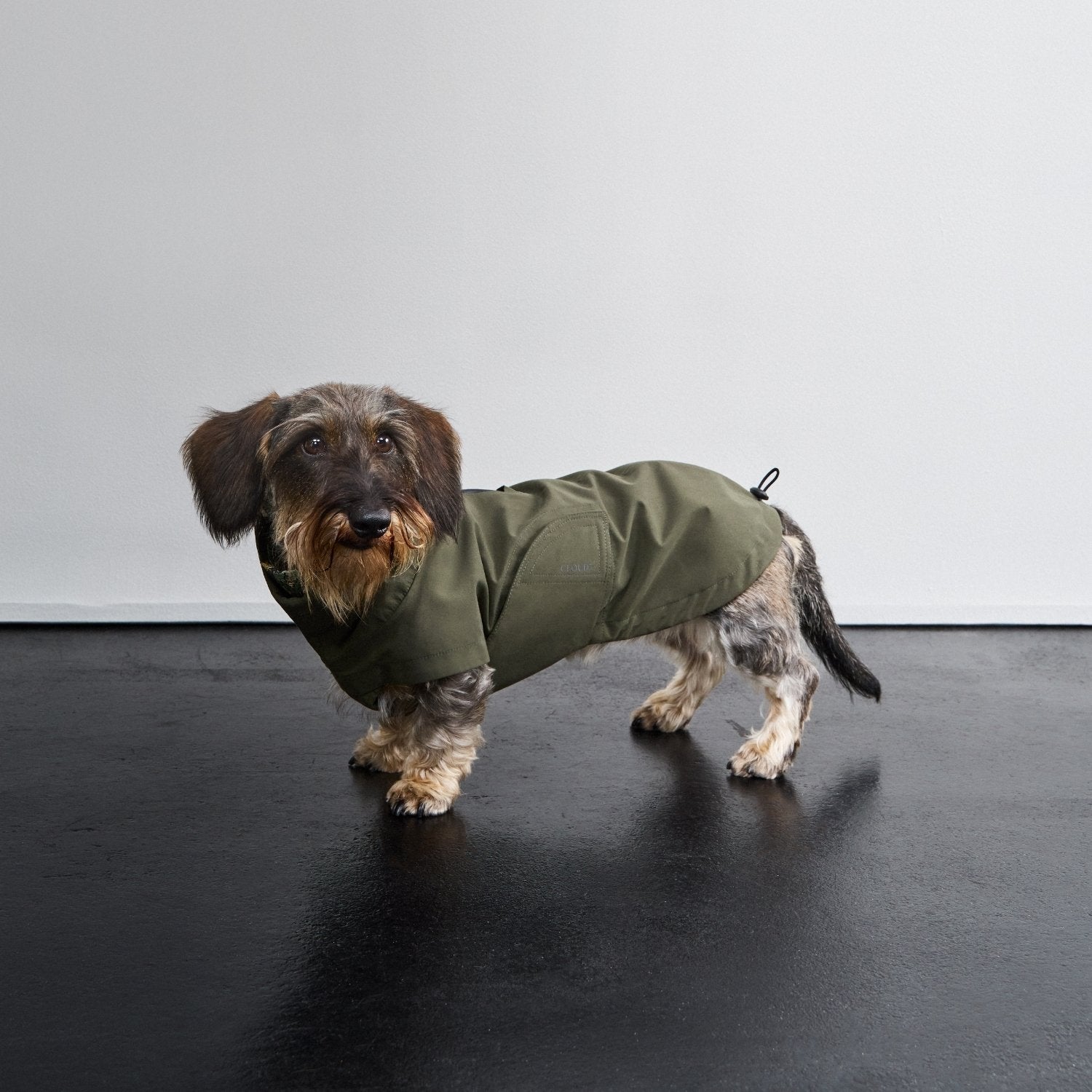 Speziell für Dackel. Samtig weicher, wasserdichter Regenmantel für Dackel in Dark Olive, hergestellt mit hohem Anteil recycelter Materialien.
