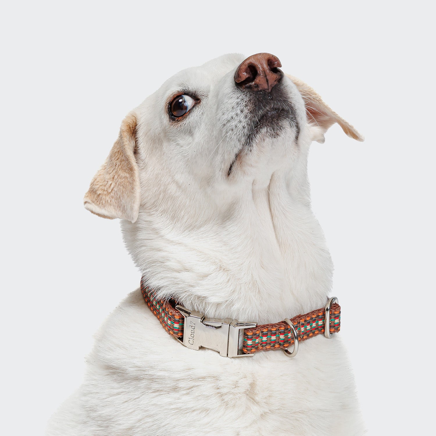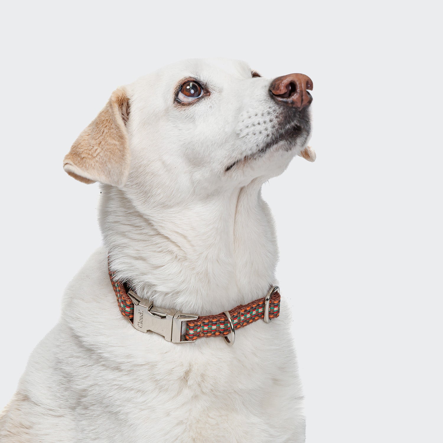 Veganes Hundehalsband aus strukturiertem Stoffband in Orange-Braun-Weiß gemustertem Ethno-Look. Die Größe lässt sich variabel verstellen während der Klickverschluss einfaches An- und Ausziehen ermöglicht.