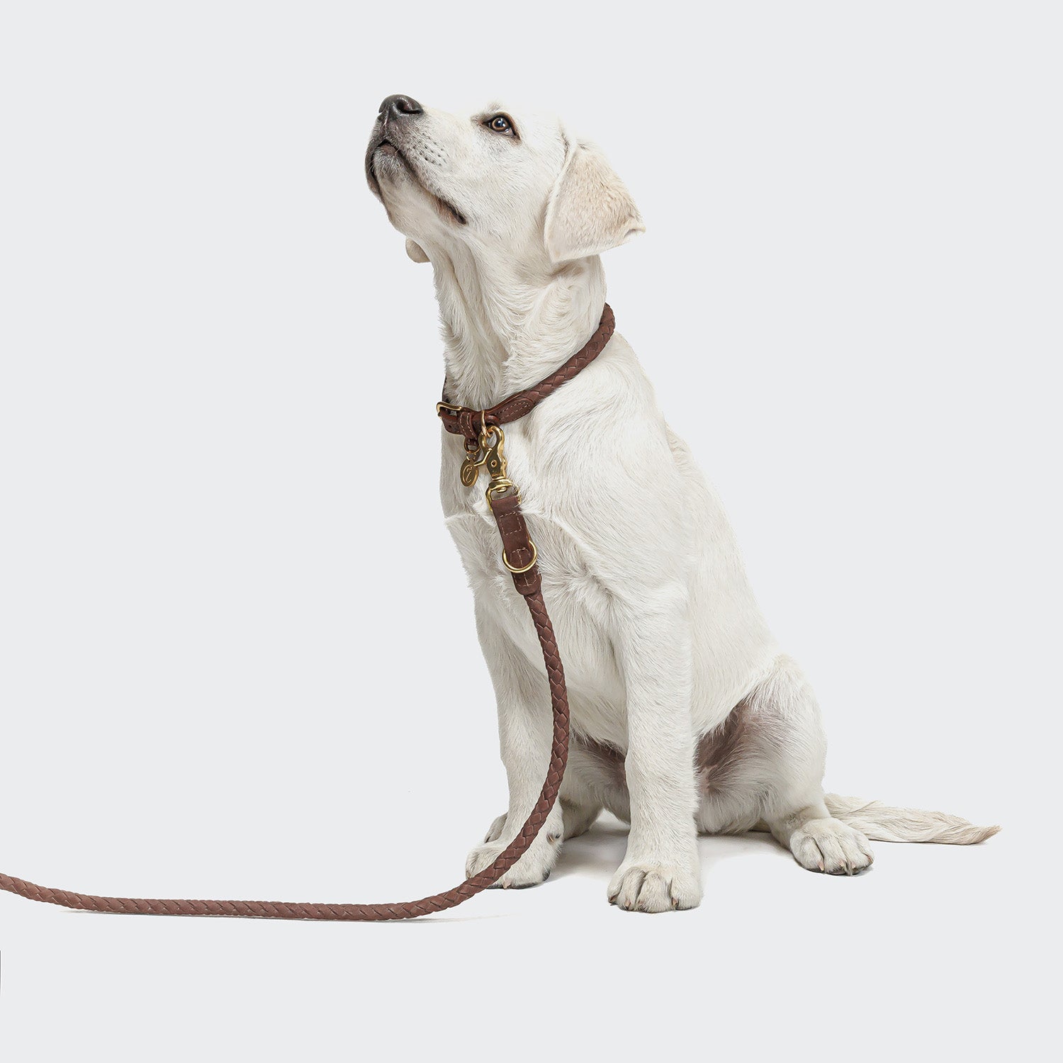 Längenverstellbare Hundeleine aus geflochtenem Nubukleder in Nussbraun.