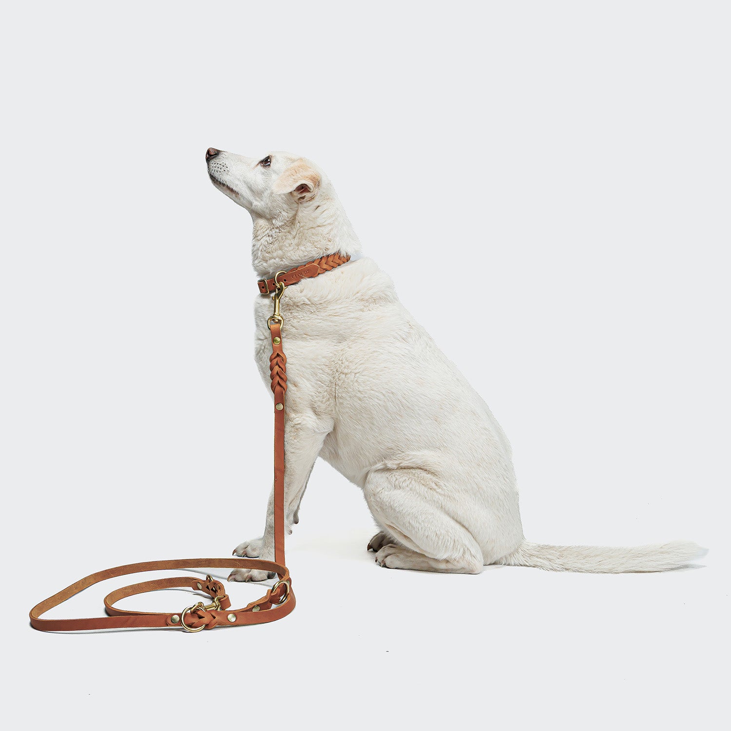 Längenverstellbare Fettleder Hundeleine aus besonders weichem Leder mit geflochtenen Details in Cognac-Braun mit Karabiner und Nieten aus Messing.