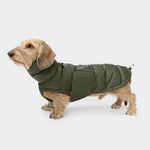 Veganer Dackelmantel aus 100% nachhaltigen Materialien. Der extra warme Wintermantel für Dackel in zeitlosem Light Olive ist anstelle von Daunen mit Eco Puffer aus recycelten PET-Flaschen gefüttert.