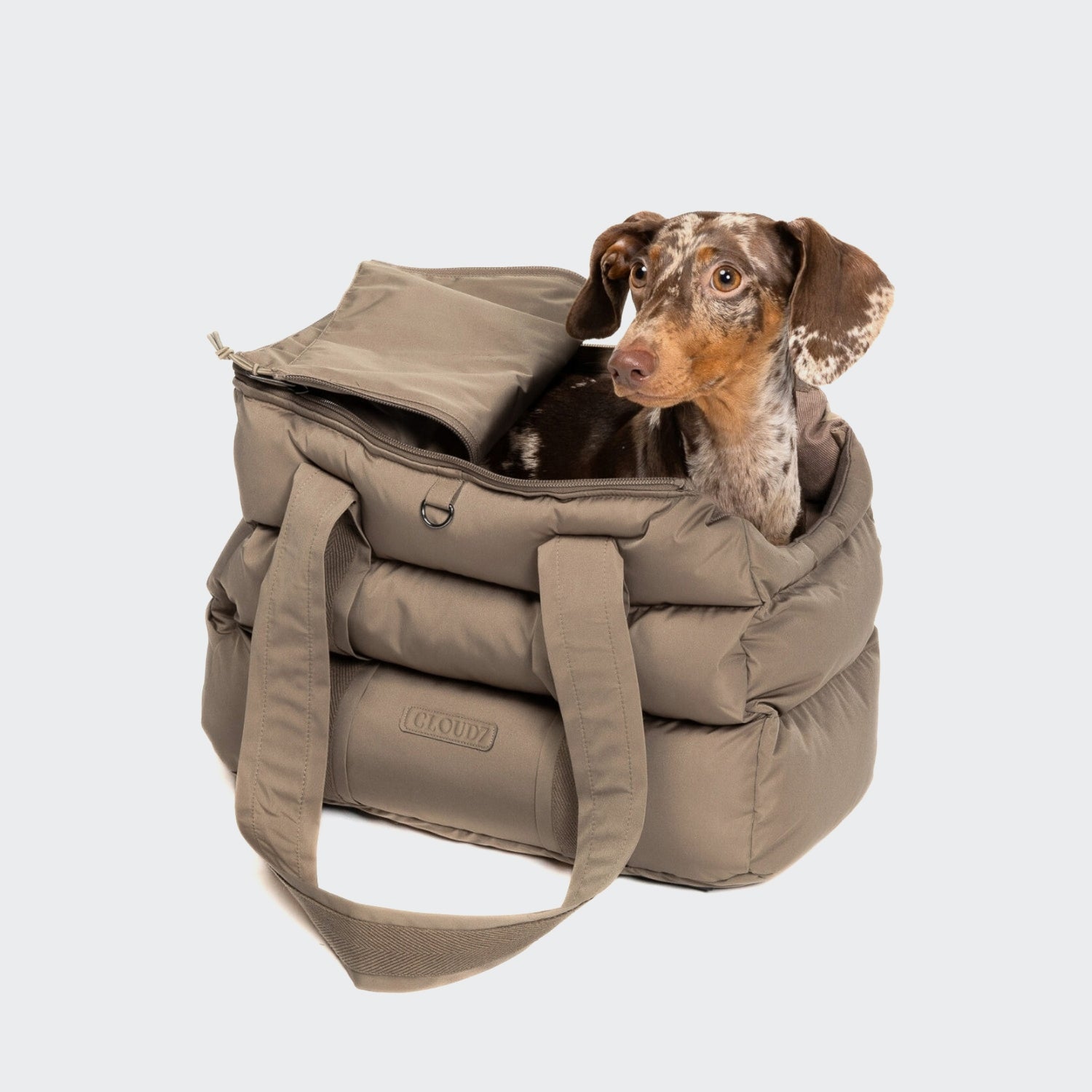 Beige Hundetasche für kleine Hunde aus recycelten Materialien als mobiles Hundebett für unterwegs. Die gemütliche Hundetragetasche im Daunen-Look ist mühelos waschbar und mit besonders nachhaltigem Eco Puffer gefüttert.