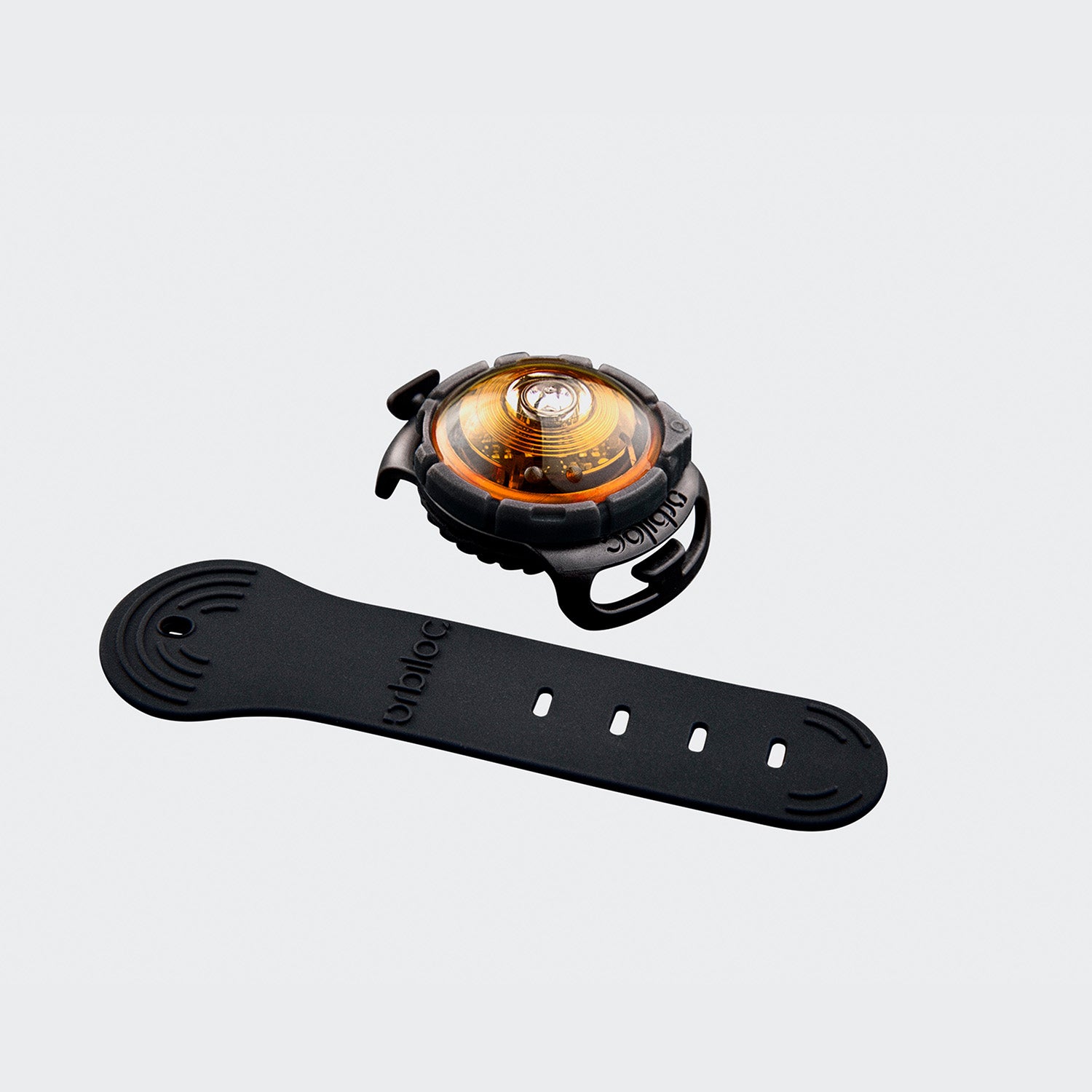 Oranges LED-Licht zur Befestigung an Hundehalsband und Hundegeschirr von Orbiloc® für maximale Sichtbarkeit im Dunkeln. Das helle Sicherheitslicht verwandelt jedes Hundehalsband in ein Leuchthalsband.