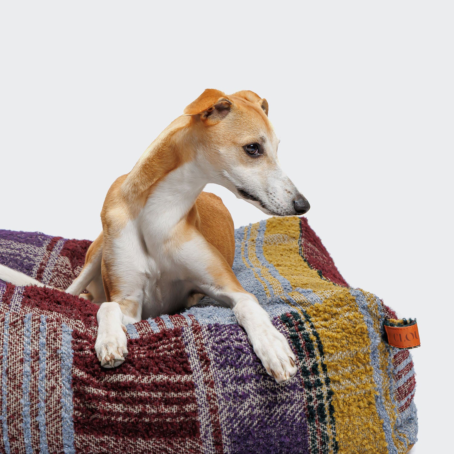 Handcrafted luxury dog bed with purple and red tinged check-patterned Belgian fabric.