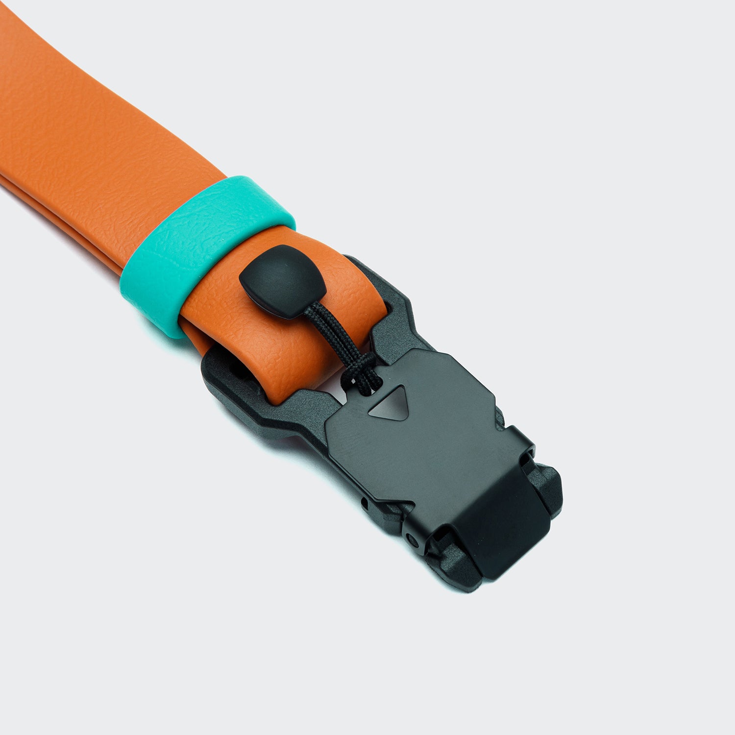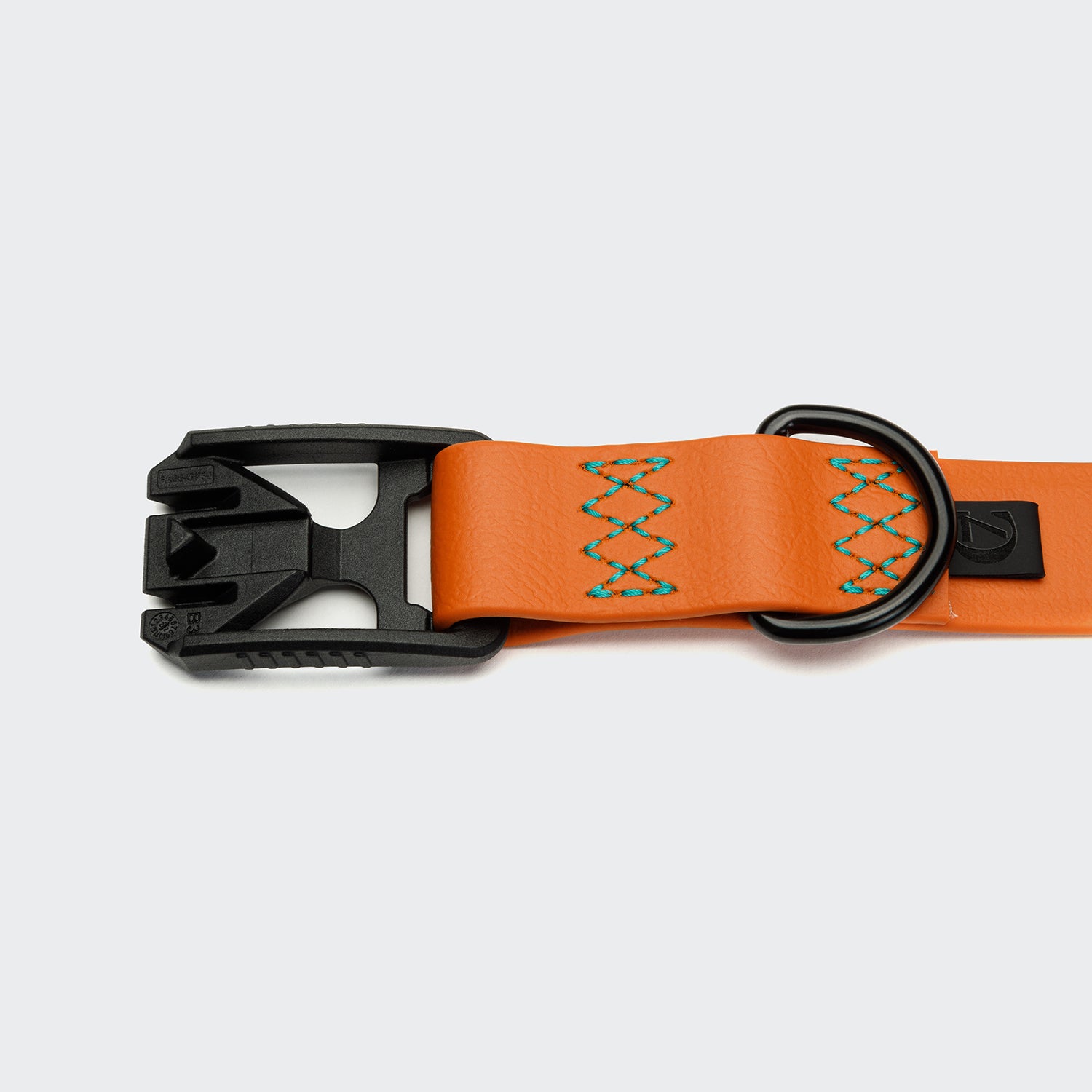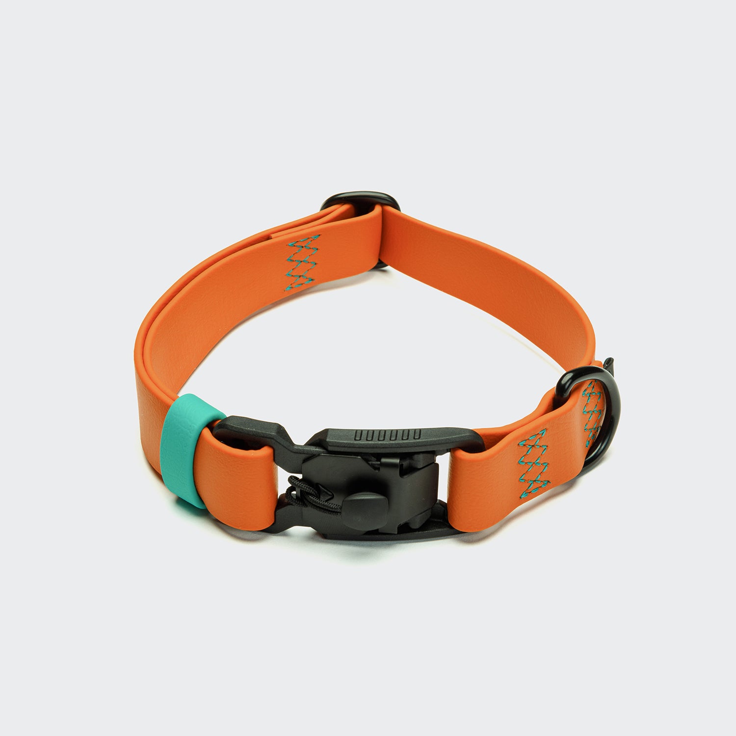 Innovative and extremely strong BioThane® dog collar with magnetic clasp in two-toned colour combination orange and aqua. Lightweight and waterproof.