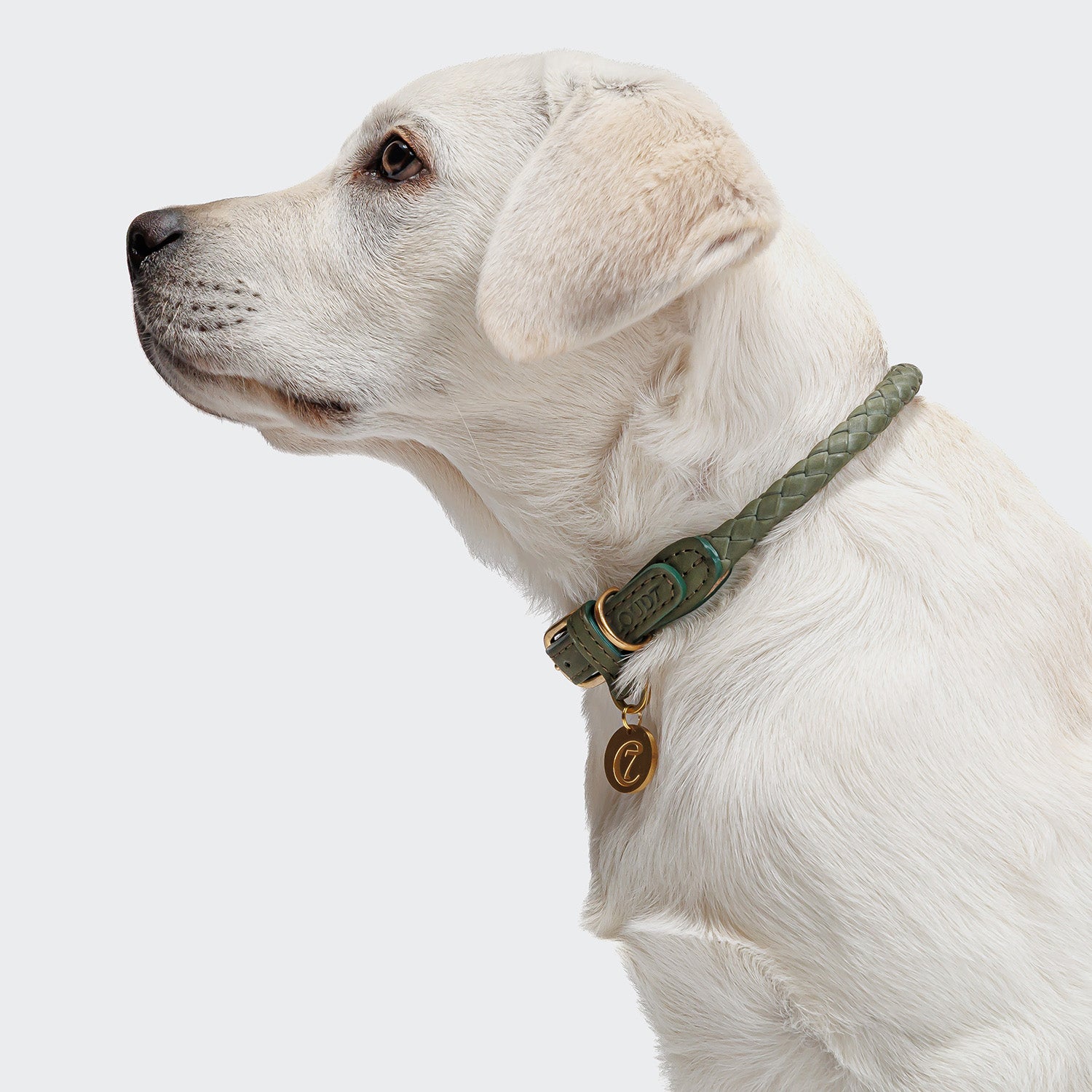 Handcrafted braided dog collar in olive green made from the finest Nubuck leather detailed with high quality genuine brass hardware.