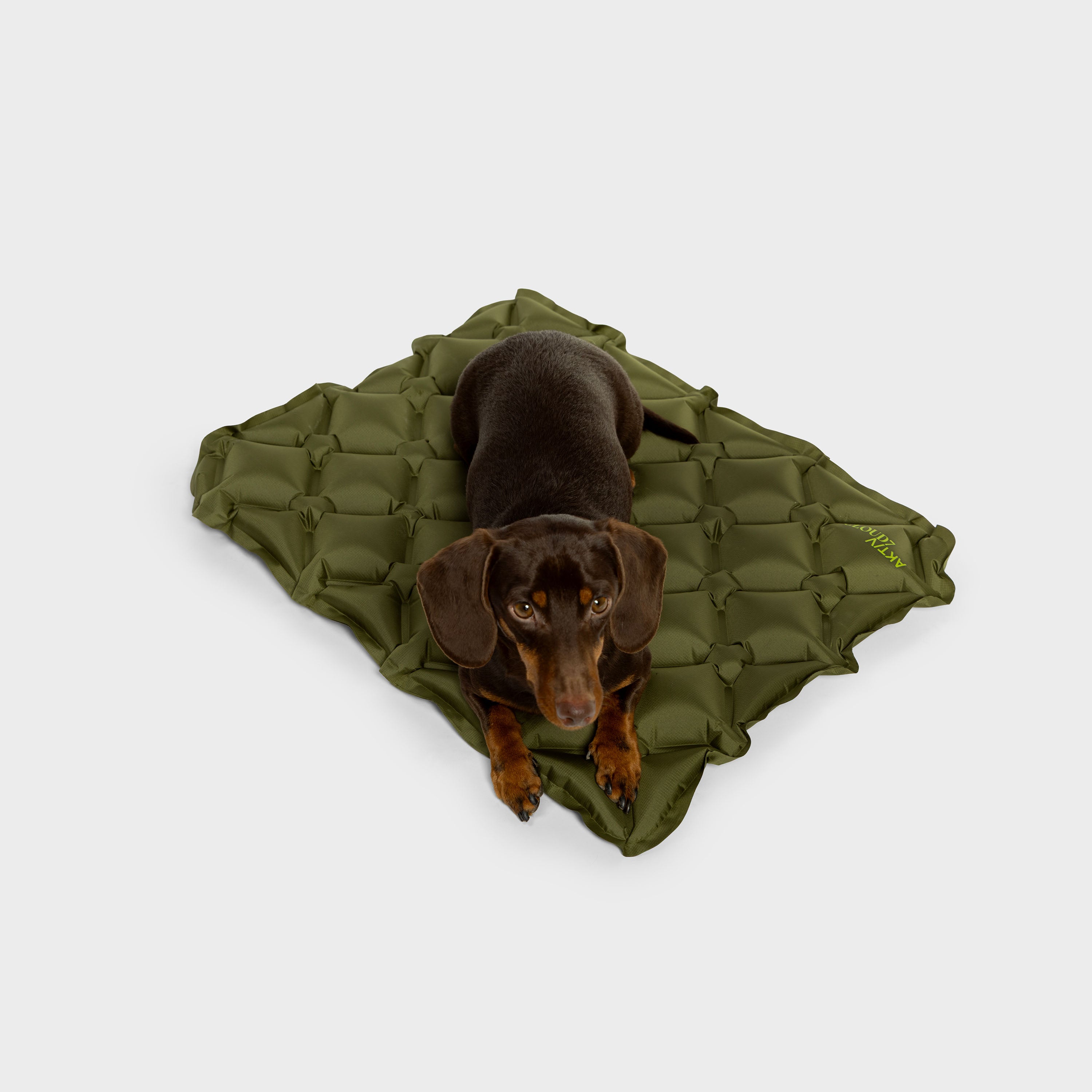 Ultra-lightweight, inflatable dog travel mat made from robust ripstop material for comfortable rest periods on the go.