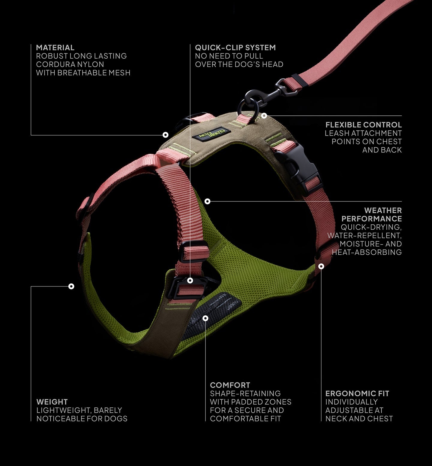 This dog harness is made from durable Cordura nylon and lined with breathable mesh fabric. Its ergonomic design is complemented by adjustable straps at the neck and chest, allowing for a perfect fit tailored to the individual shape of the dog.