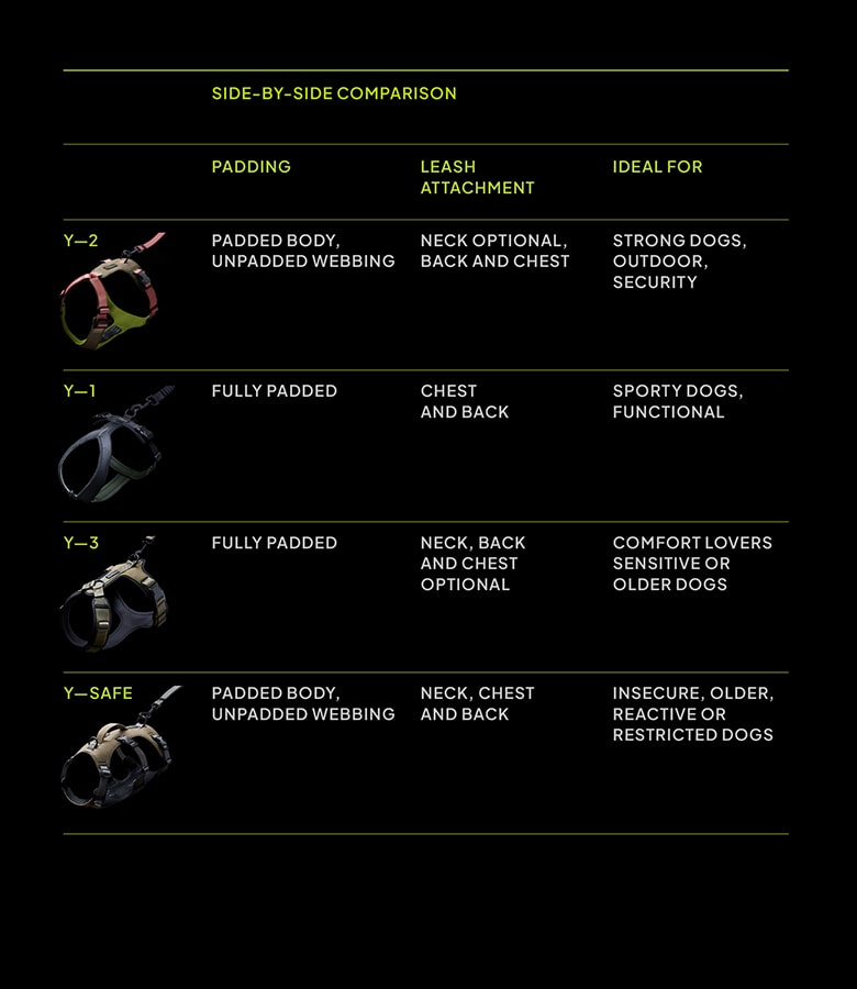 The Y2 harness stands out for its robust construction, precise fit, and use of durable, long-lasting materials. Even in wet conditions or strong sunlight, it retains its shape and reliability. Water-repellent, quick-drying, and easy to clean, this harness is perfect for active dogs, adventurous outings, and everyday use in all weather.