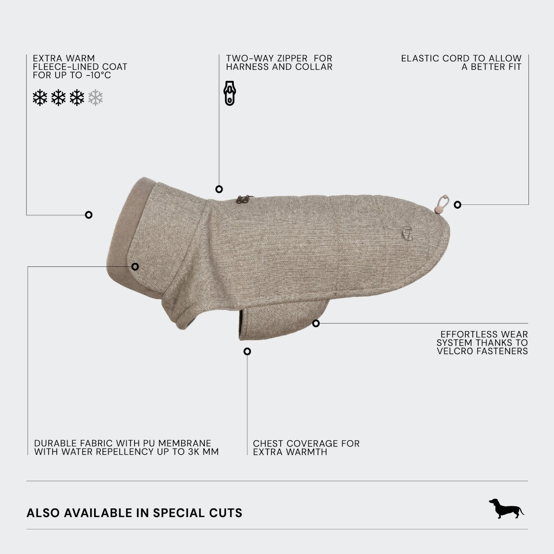 A winter coat specially designed for Dachshunds, offering a comfortable fit, lined with warm fleece, and finished with an easy-care, waterproof tweed fabric from Italy in beige.