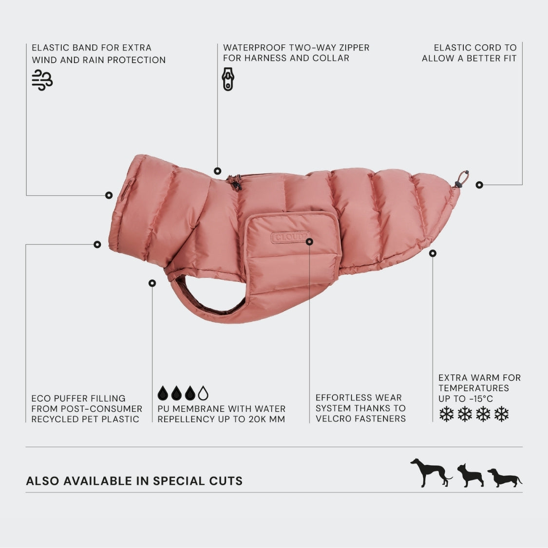 - Long, waterproof two-way zip for dogs wearing a harness