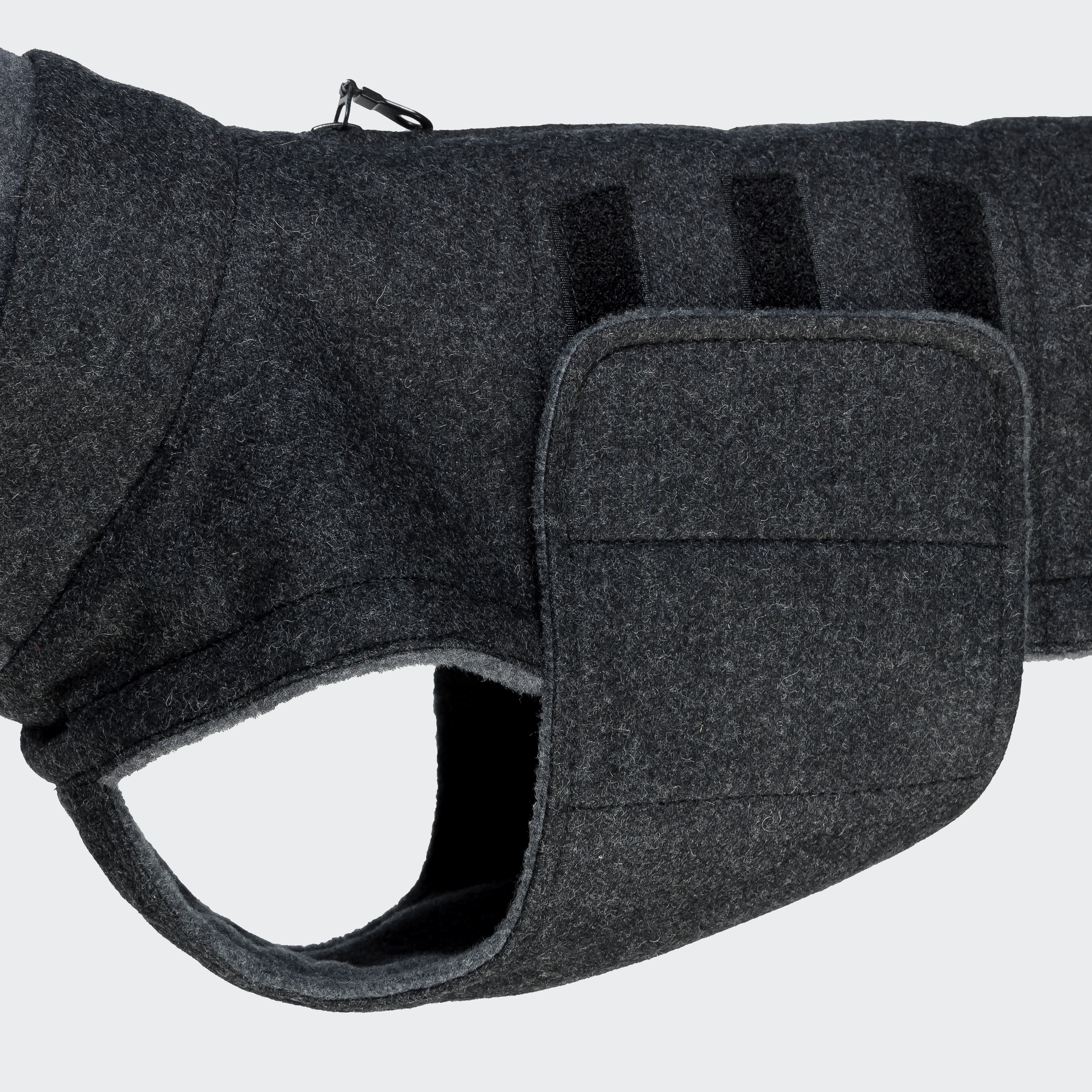 A dog coat tailored to fit Dachshunds. Detailed with warm fleece lining, extremely water-repellent wool blend and a comfortable fit in elegant Anthra.