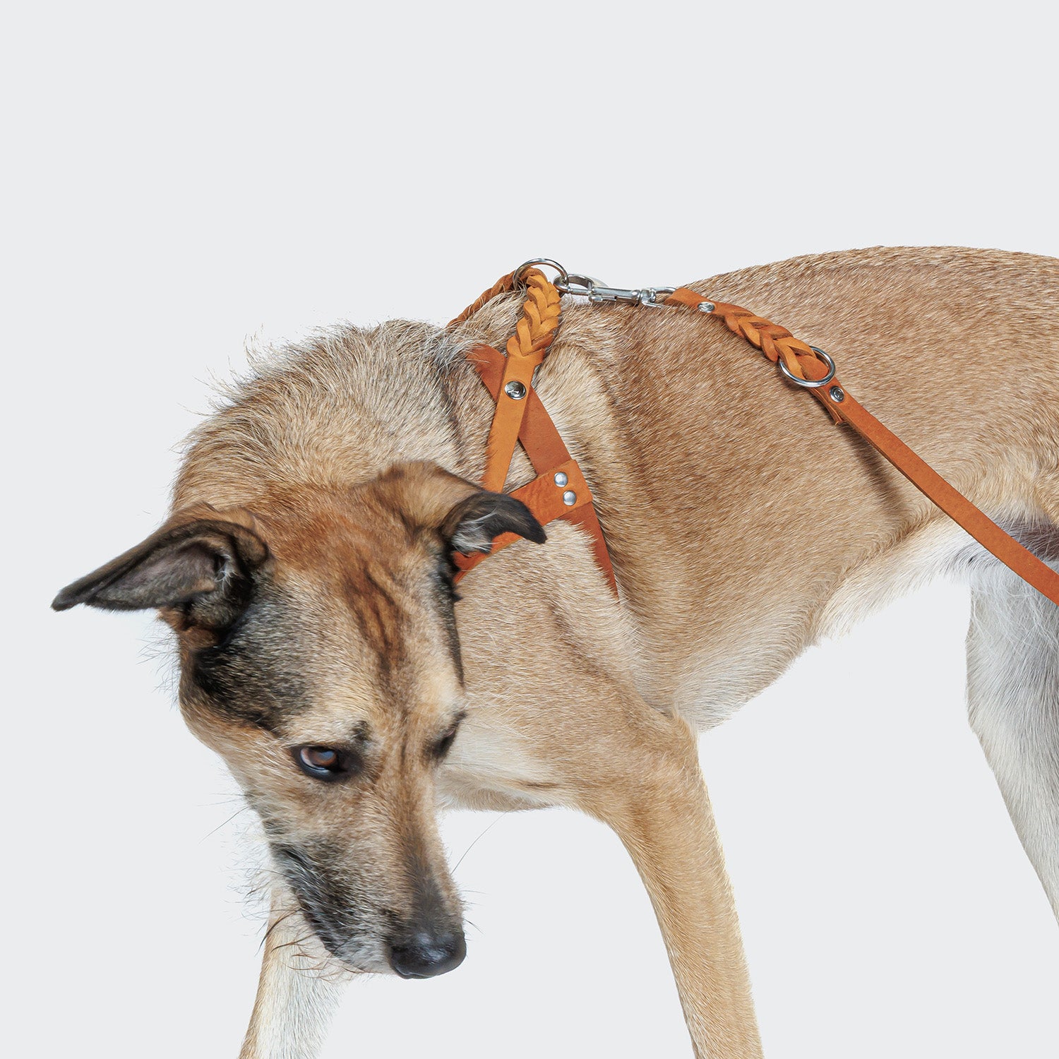 Greased leather dog harness (Norwegian harness) in caramel brown with stainless steel finishing and collar buckle.