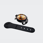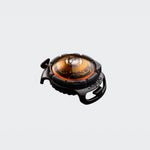 Easily attachable Orbiloc® orange LED light to dog collar or dog harness for high visibility in darkness. The bright safety light transforms any dog collar into a light up dog collar.