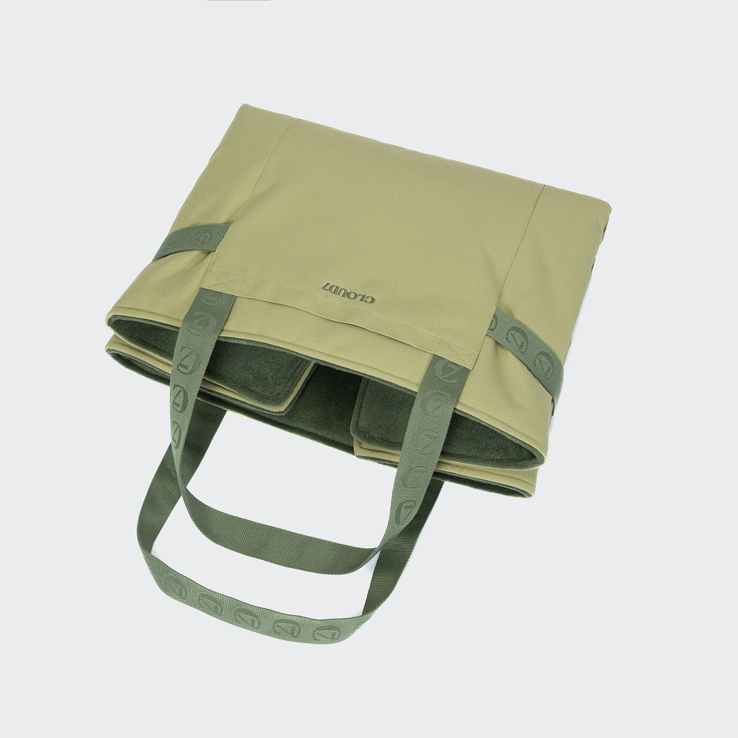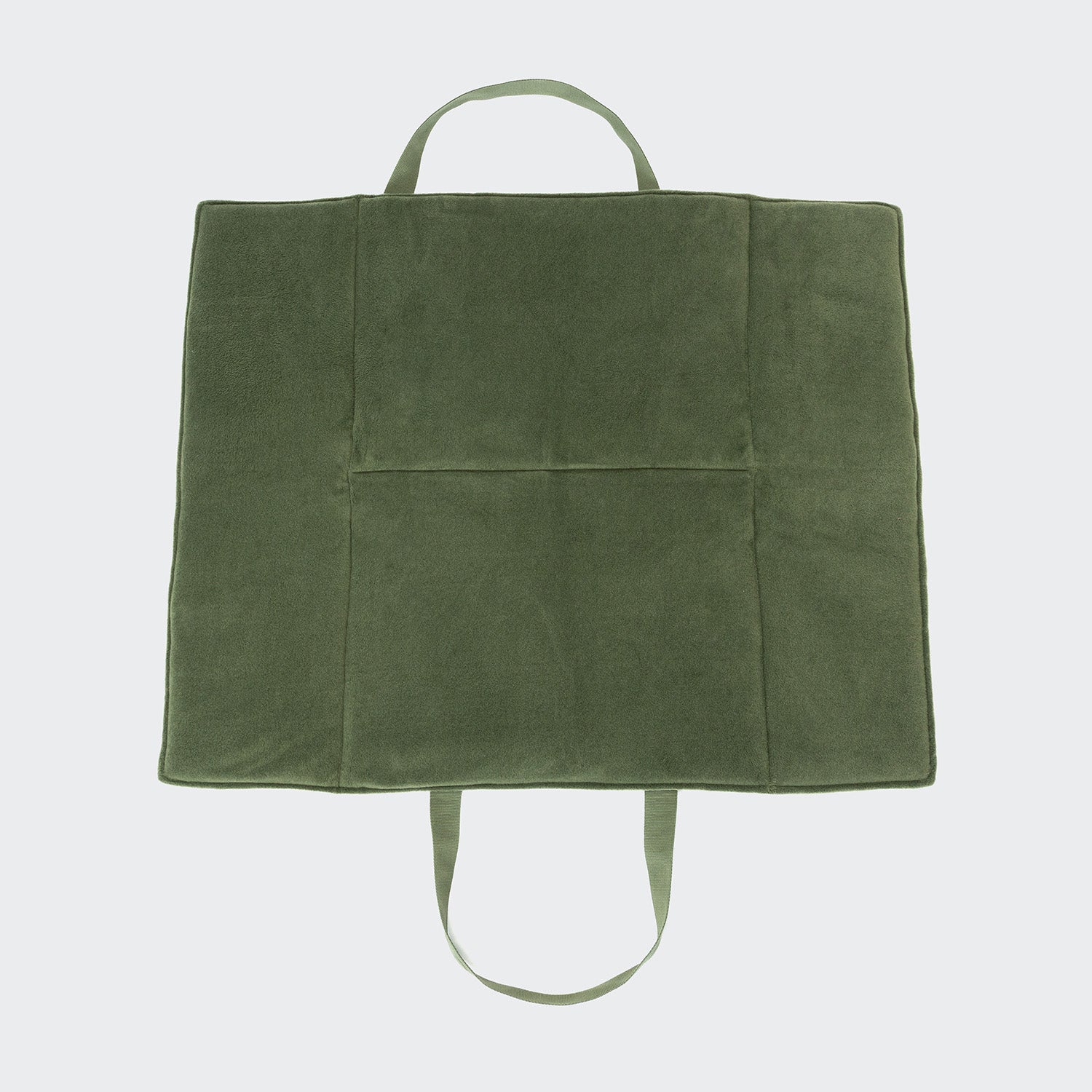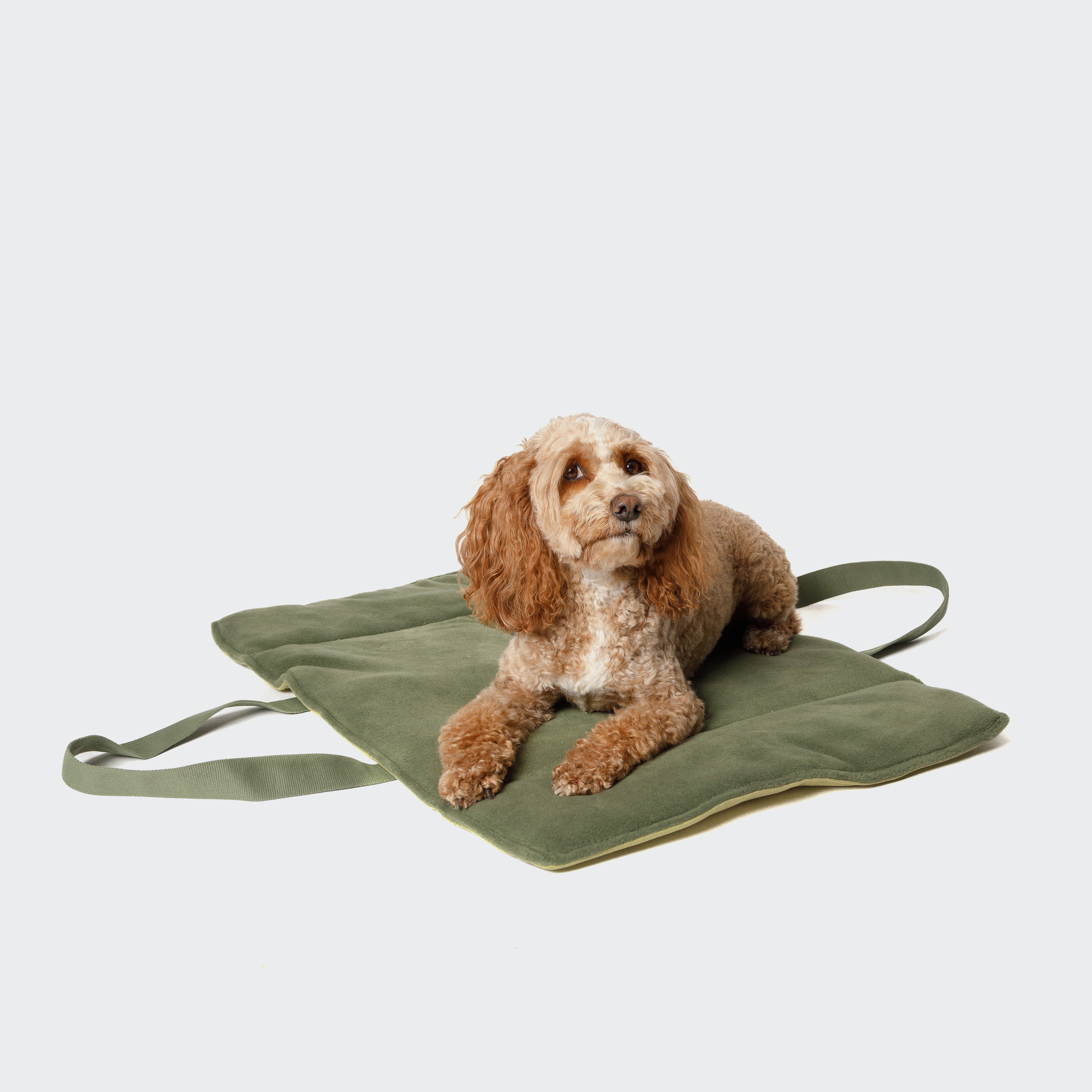Foldable and water-repellent dog travel mat with soft inner lining and practical handles for effortless transportation in fresh pistachio green with new longer handles for even more comfort.