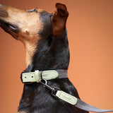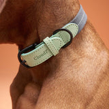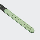 Two-toned colorblock dog collar in a combination of leather and fabric in mint green/dark grey. Lightweight yet durable webbing for easy maintenance.