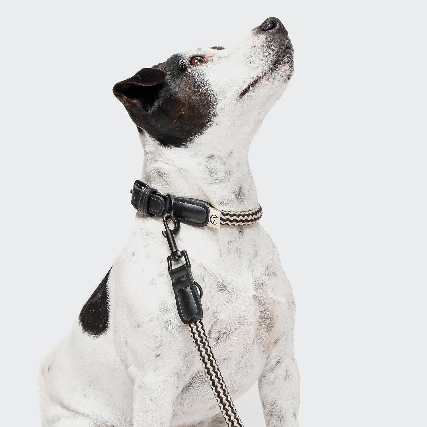 Completely vegan dog collar from cactus leather in black combined with black and white cotton rope in zigzag pattern with matte black steel detailing.