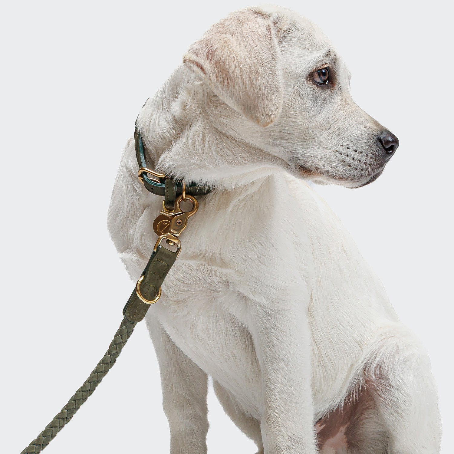Handcrafted braided length adjustable dog leash in olive green.