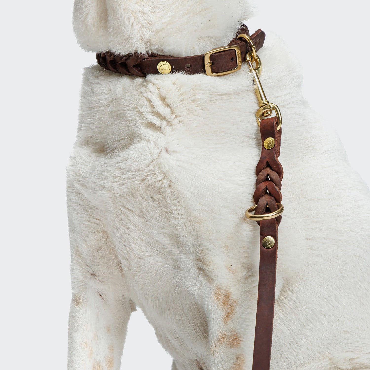 Greased leather dog leash with braiding details in chocolate brown with genuine brass carabiners and studs.