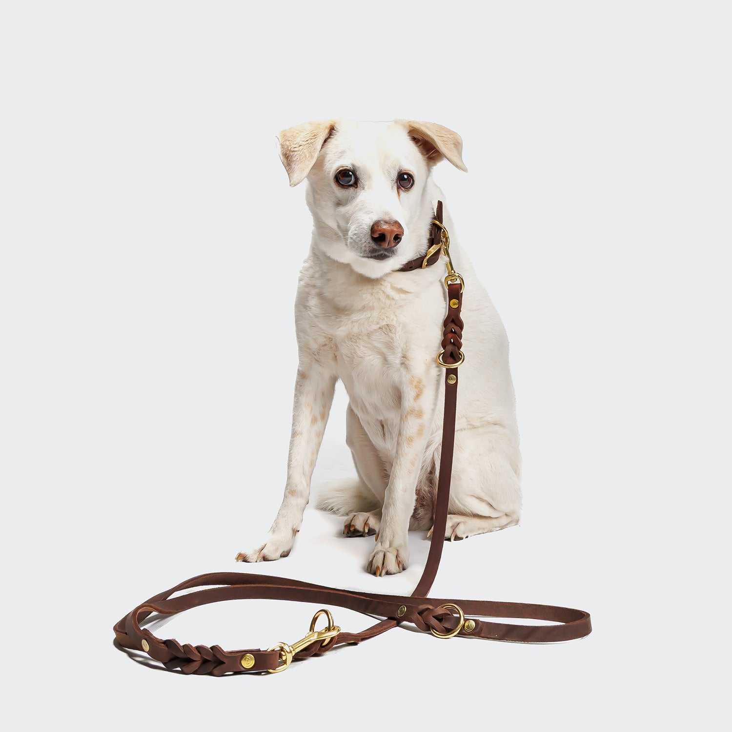 Handcrafted greased leather dog collar and dog leash of the Riverside Park collection, now with genuine solid brass hardware in gold. The double ended adjustable leash is multifunctional and offers 3 various dog leash styles in one (handsfree leash, crossbody leash & short training leash). Greased leather is particularly soft yet durable for everyday wear seen through its extensive use throughout horse equipment. Smooth leather has the characteristics to soften and darken with time and wear, thus developing its very own unique patina. Just like any other leather products, regular maintenance through conditioning will help the dog collars, dog leads and dog harnesses to last for many years.