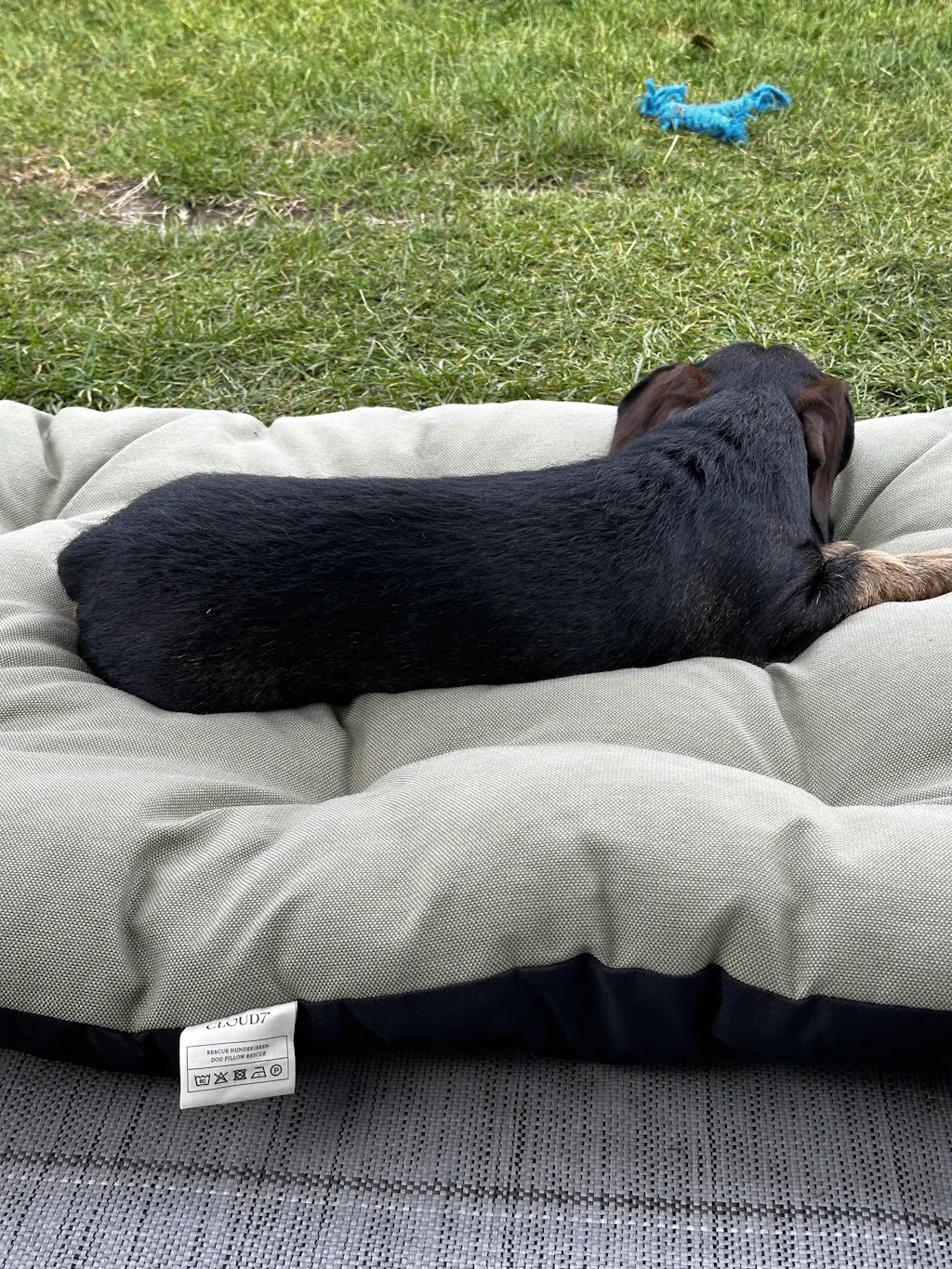 Unser Hund liebt sein Kissen. Darauf kann er sich richtig gemütlich ausstrecken, im Sommer einfach so und in der kühleren Jahreszeit mit einer Decke. Daneben steht sein farblich passendes „Hundekissen Lazy Canvas“ (ebenfalls von cloud7), in dem er sich bei Bedarf einkringeln kann.