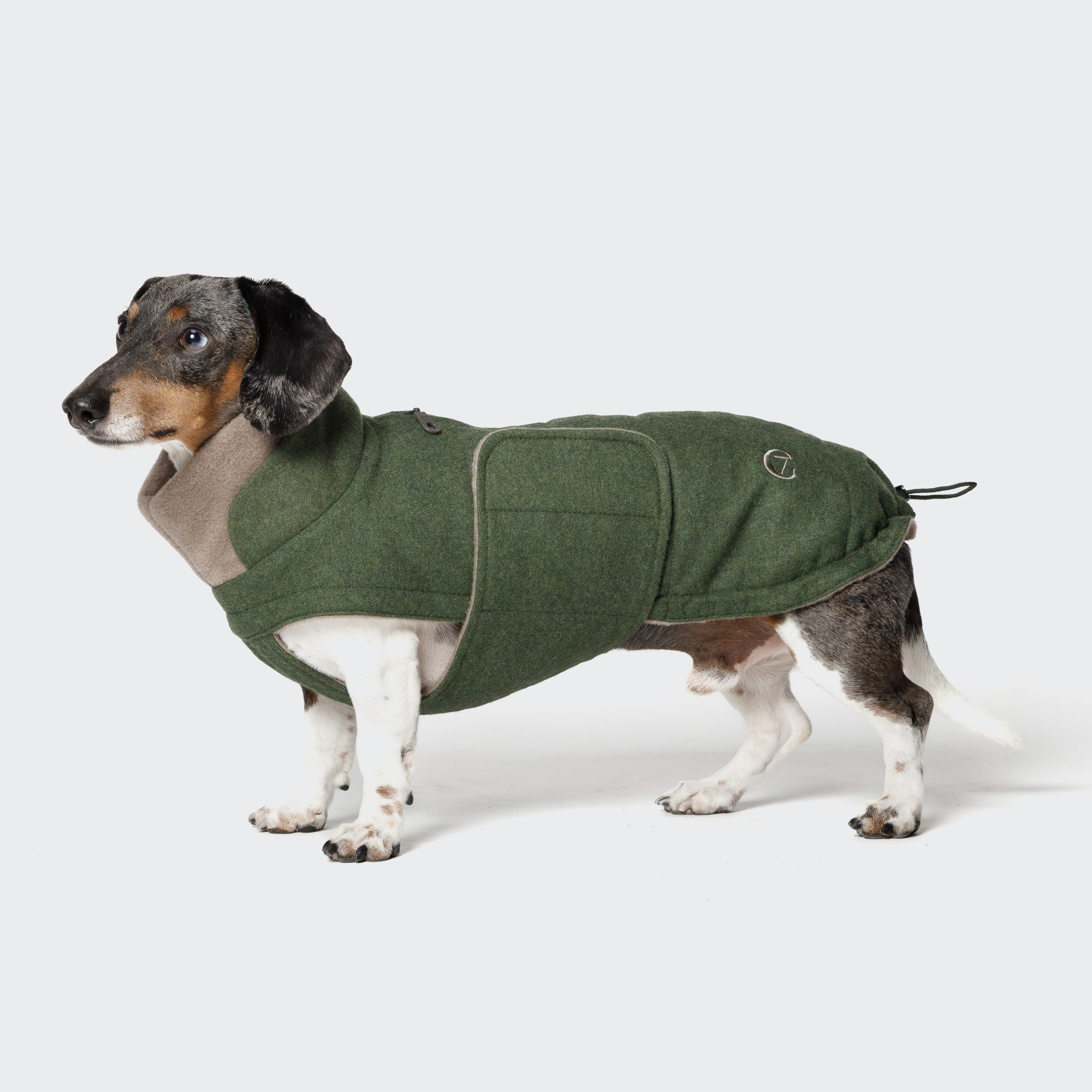 A dog coat tailored to fit Dachshunds. Complete with a comfortable fit, warm Fleece lining and extremely water-repellant wool mix fabric along with elegant design in dark green hue for Autumn.