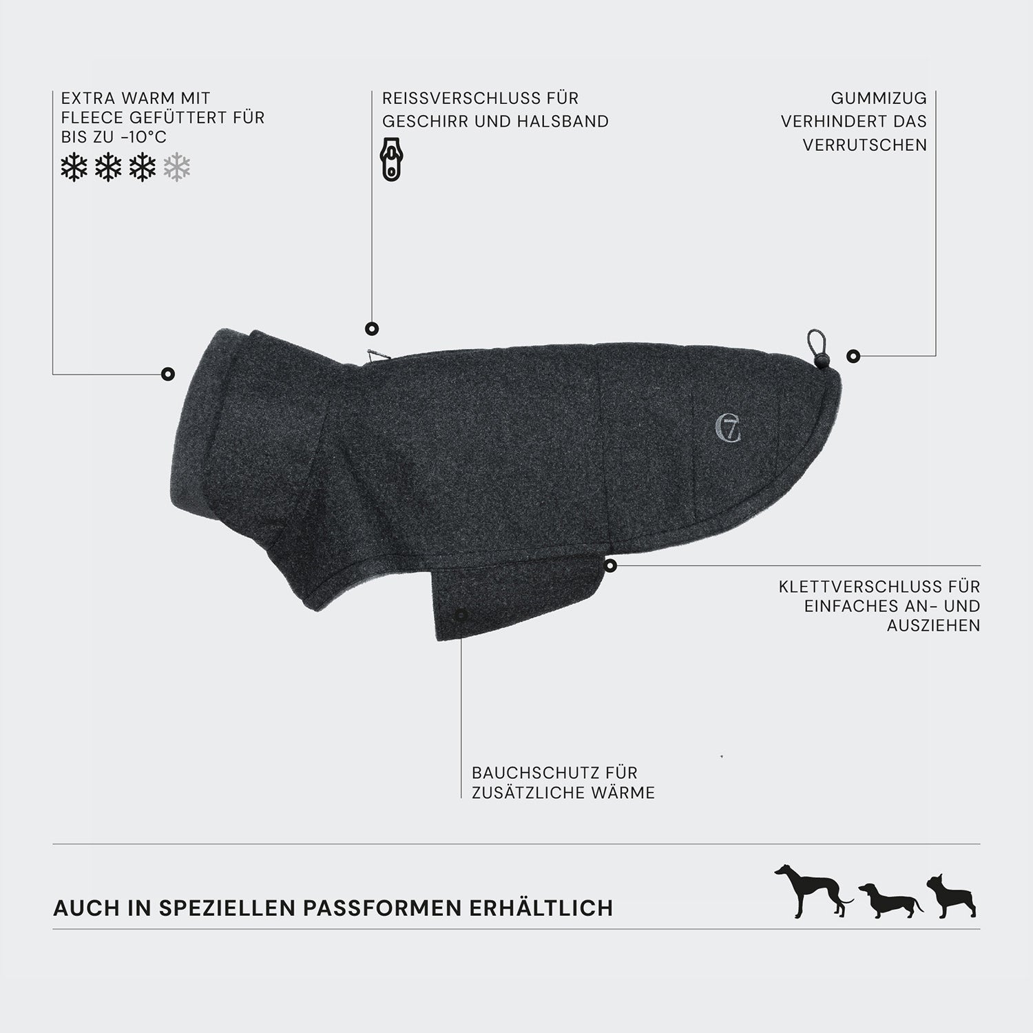 CLOUD7 classic dog winter jacket Brooklyn provides Kaninchen Dachshunds, Miniature Dachshunds and Standard Dachshunds warmth on belly, back and organs without interfering with the natural movements of the dog. The effortless waistband system and practical elastic band on the rear prevent the dog winter coat from moving around during plays and runs. Thanks to the zipper on the top side of the Dachshunds winter coat, collar and harnesses are easily accessible. The minimalistic design of the warm dog coat for winter is highly water-repellant and therefore perfect as a layer of protection against the cold and wind. A specifically tailored made winter coat for Dachshund/sausage dogs/wiener dogs/teckels is important to fit their long body. Do Dachshunds need a winter coat? Dachshunds especially need a warm winter jacket for their long bodies and short legs. View also our classic cut Brooklyn or special coats for French Bulldogs, Sighthounds and Italian Greyhounds.