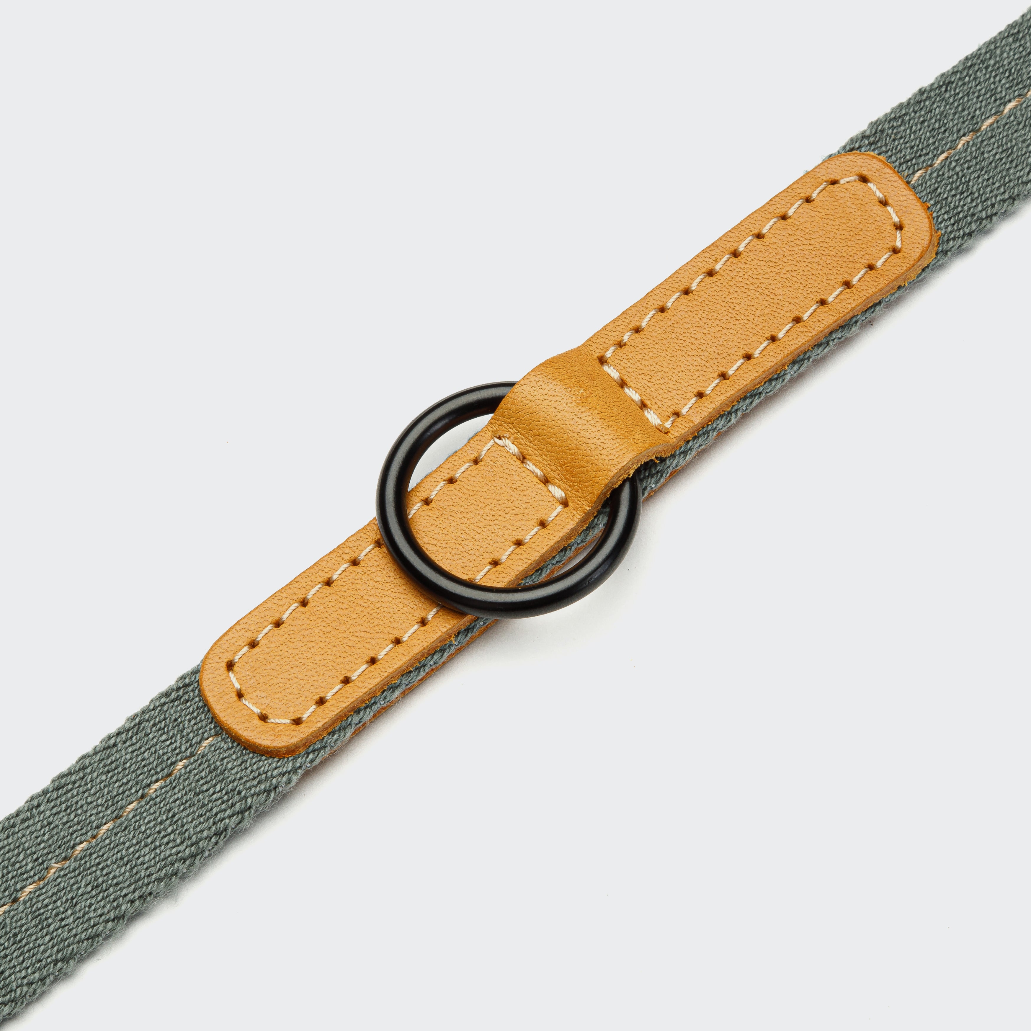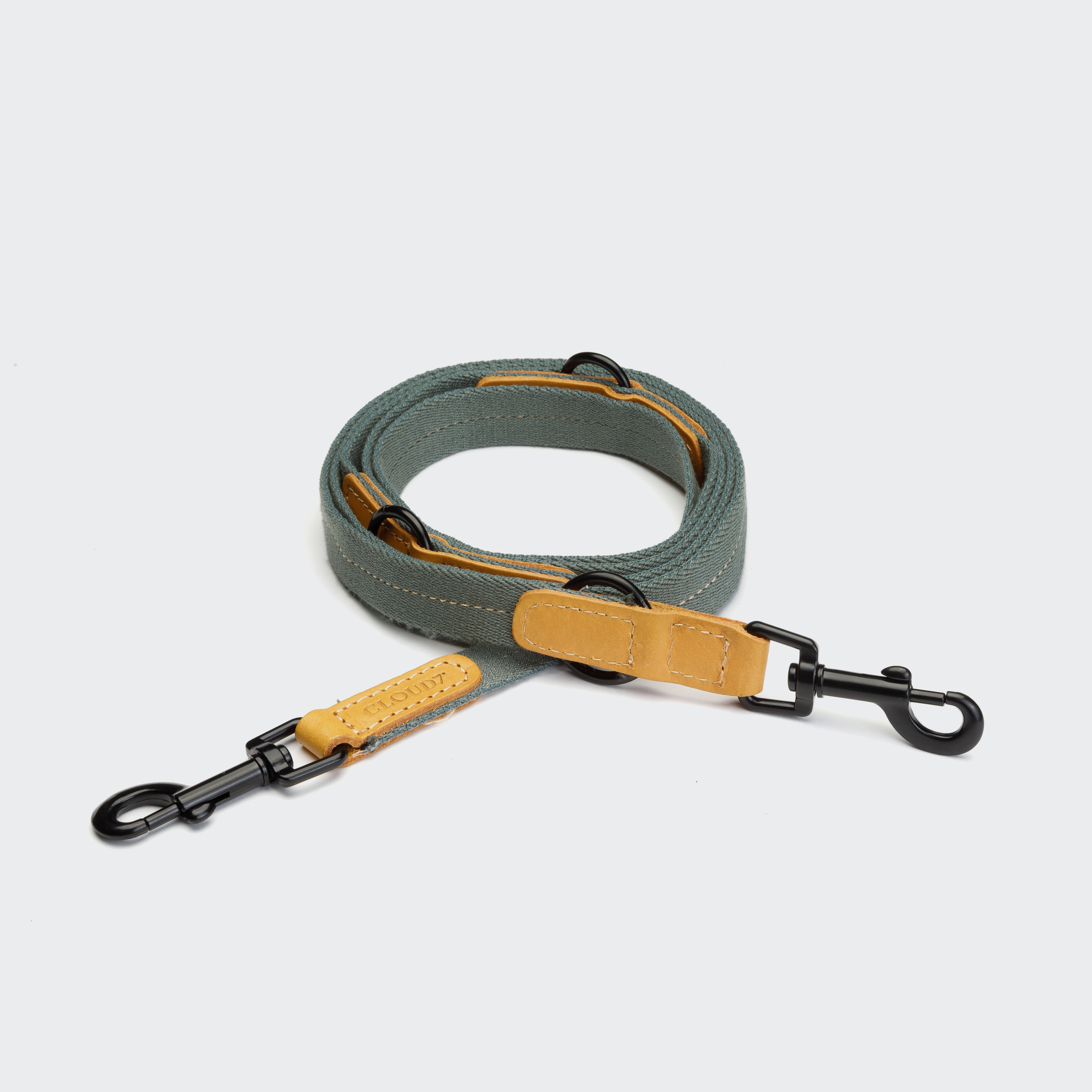 A bright and colorful dog collar and double-ended leash collection for your pack walks. The highly durable cotton webbing with the contrasting stitching is combined with vegetable-tanned leather for a fresh rounded design. The multifunctional dog leash is lightweight and can be easily adjustable in length thanks to the minimalistic black steel hardware. The 3-in-1 dog leash features a short training or city leash, a hands-free crossbody leash as well as a class long leash for more freedom.