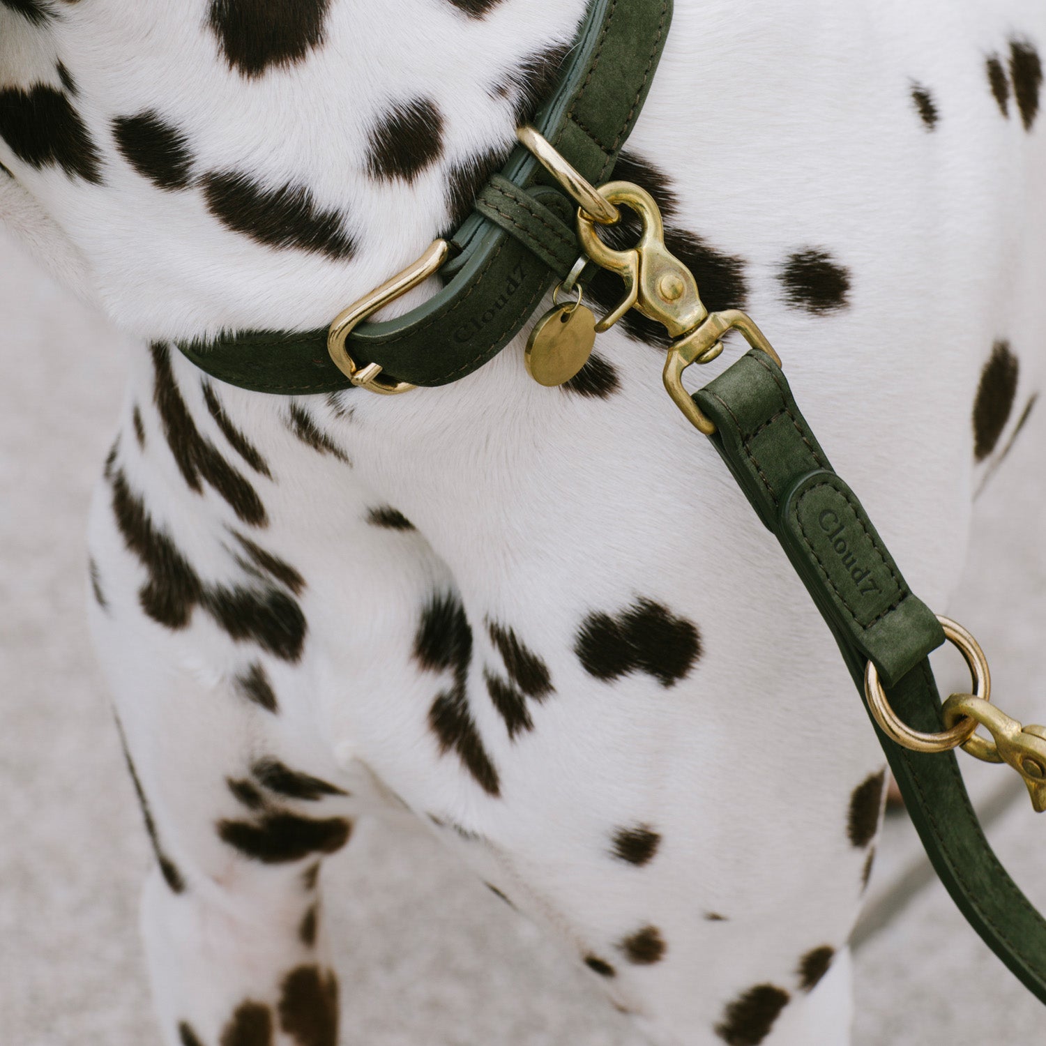 Minimalist double-ended adjustable leather dog lead from high quality Nubuck leather in muted forrest green. Genuine brass detailing.
