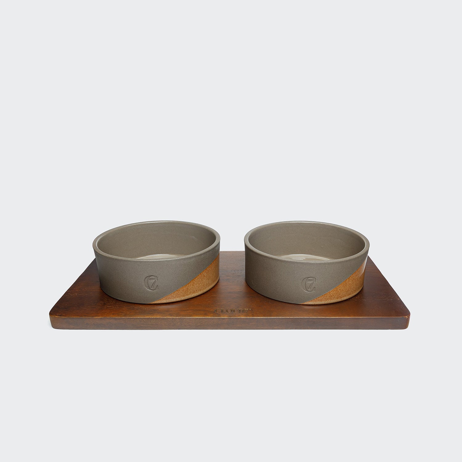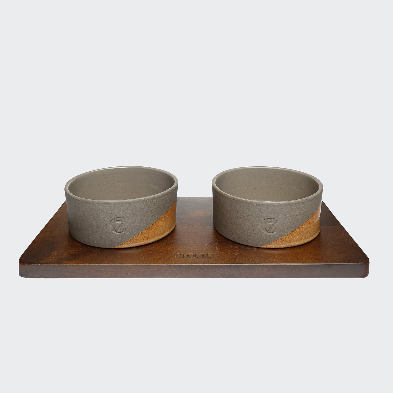 The mango wood feeding station combined with two Mauro dog bowls as a set at a special price: Save 10% when purchasing the dog bowl set compared to buying the items separately.