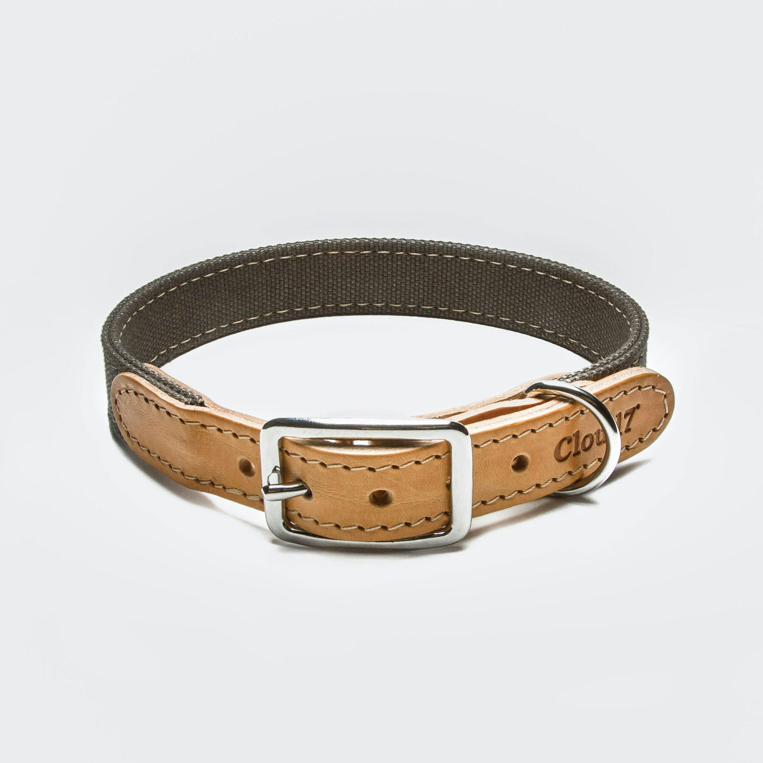 Stoff-Hundehalsband aus strapazierfähigem grauen Canvas kombiniert mit hochwertigem hellbraunen Leder und hochwertigen Metallteilen aus Edelstahl.