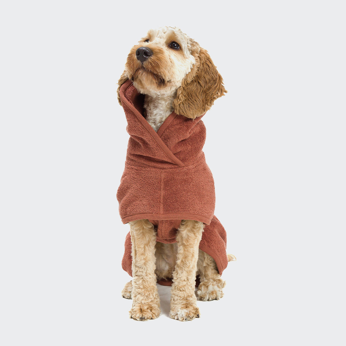 Set bestehend aus kuscheligem Hundebademantel und Hundehandtuch aus Bio-Baumwolle mit samtiger Innenseite. Der weiche Frotteestoff in Ziegelrot ist dabei besonders dick und saugstark.