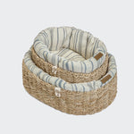 Design Hundekörbchen aus natürlichem Seegras in ovaler Form, kombiniert mit einem neuen weichen Hundekissen im sommerlich blau gestreiften Look. Die robusten Materialien des gemütlichen Hundekorbs sind langlebig und das Kissen aus Leinen-Mix mühelos waschbar.