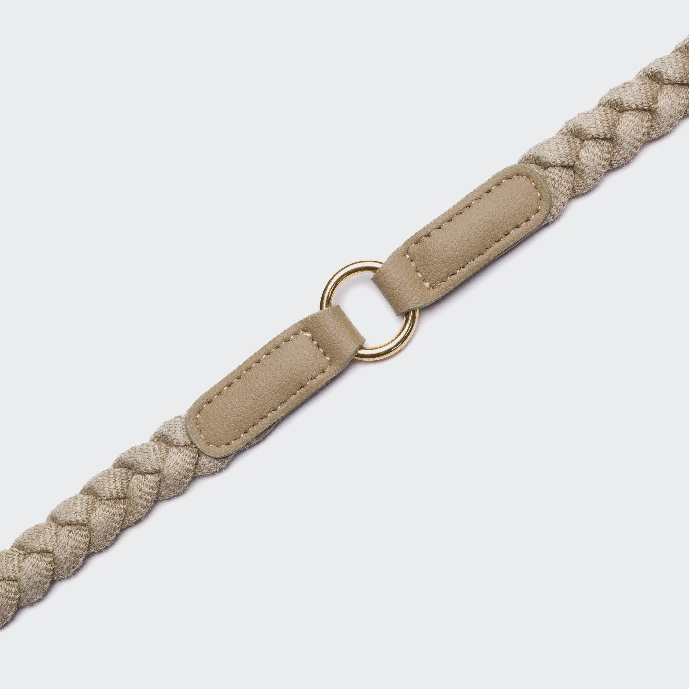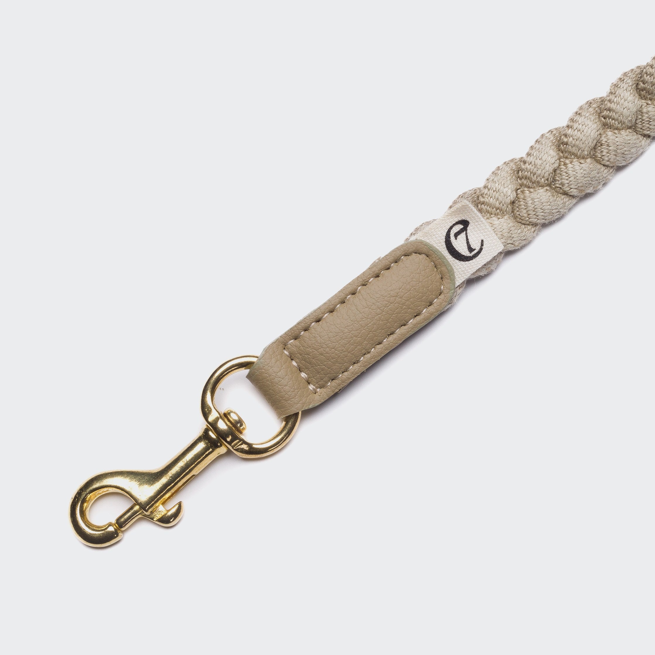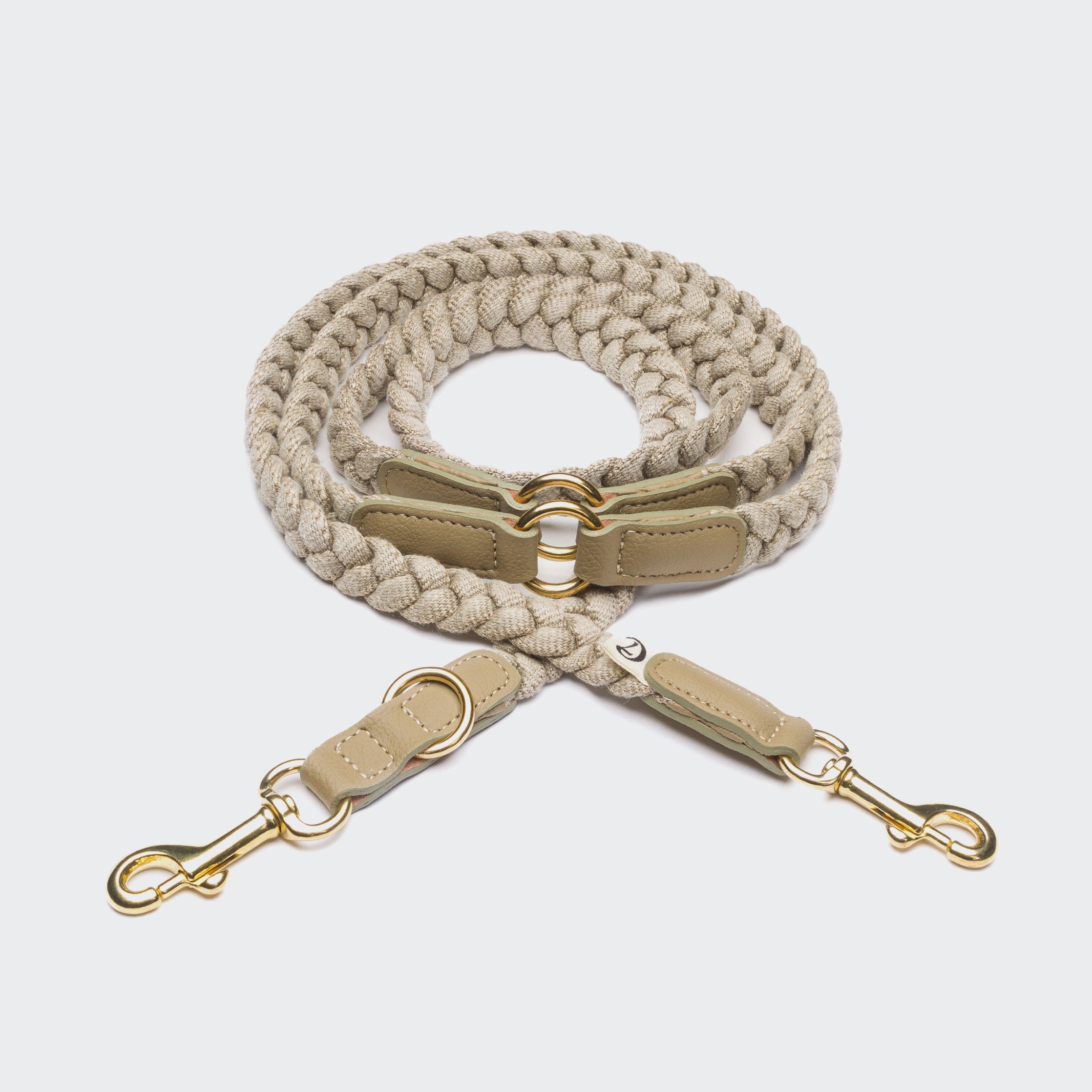 Vegane geflochtene Seilleine für Hunde in Beige kombiniert mit hellem Kaktus-„Leder“ und Details aus Messing.