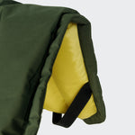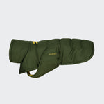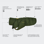 Sehr warmer, funktionaler Hunde Wintermantel in Olivgrün aus extra wasserabweisenden Materialien mit Gummibändern zur Befestigung an den Hinterbeinen, damit nichts verrutscht.